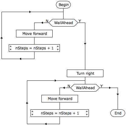 - Run the program and click the button "Show variables", so that you can watch the variable nSteps value changing when the robot moves. - Try to run the program for different initial positions of the robot : the program will end with different values of nSteps |